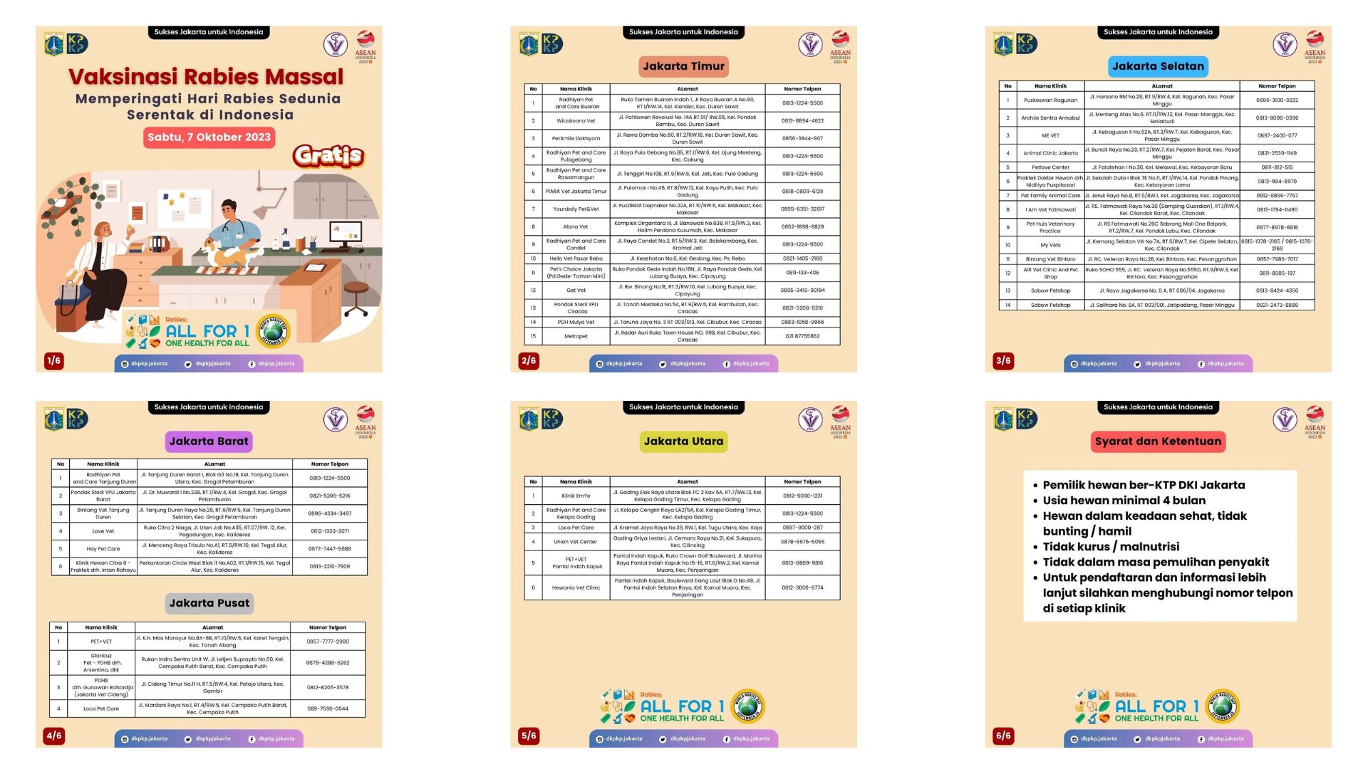 Kegiatan akan dilaksanakan pada hari Sabtu tanggal 7 Oktober 2023. Bagi Sobat pemilik anabul yang ingin mendapatkan pelayanan vaksinasi rabies gratis, yuk simak lokasi dan syarat ketentuannya melalui infografis berikut ini!